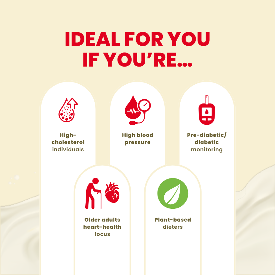 Selain beta-glukan, ia juga mengandungi Koenzim Q10, biji rami dan beras perang, yang menyokong kesihatan jantung dan menurunkan kolesterol dengan lebih berkesan berbanding minuman oat biasa.