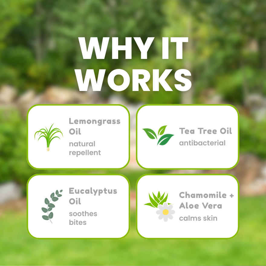 • Eucalyptus Oil – Soothes bites and supports skin relief