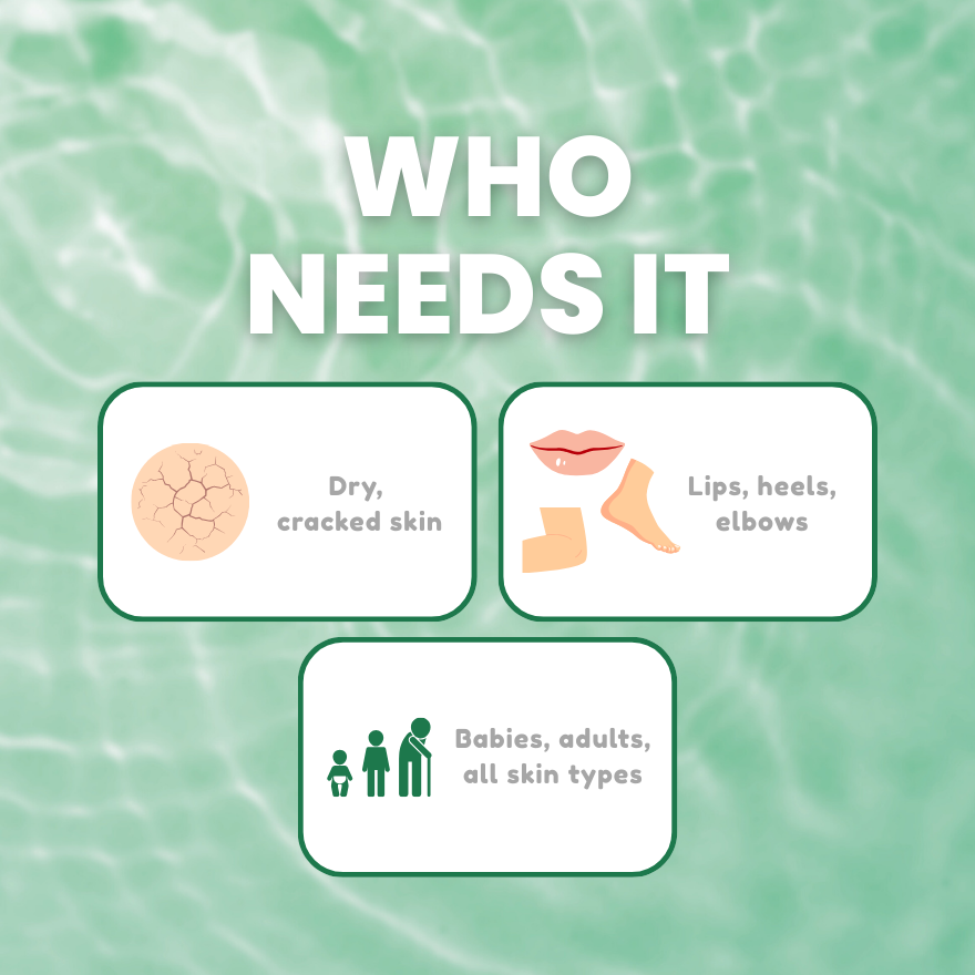 - Multi-purpose balm for dry skin, cracked heels, lips, and hands